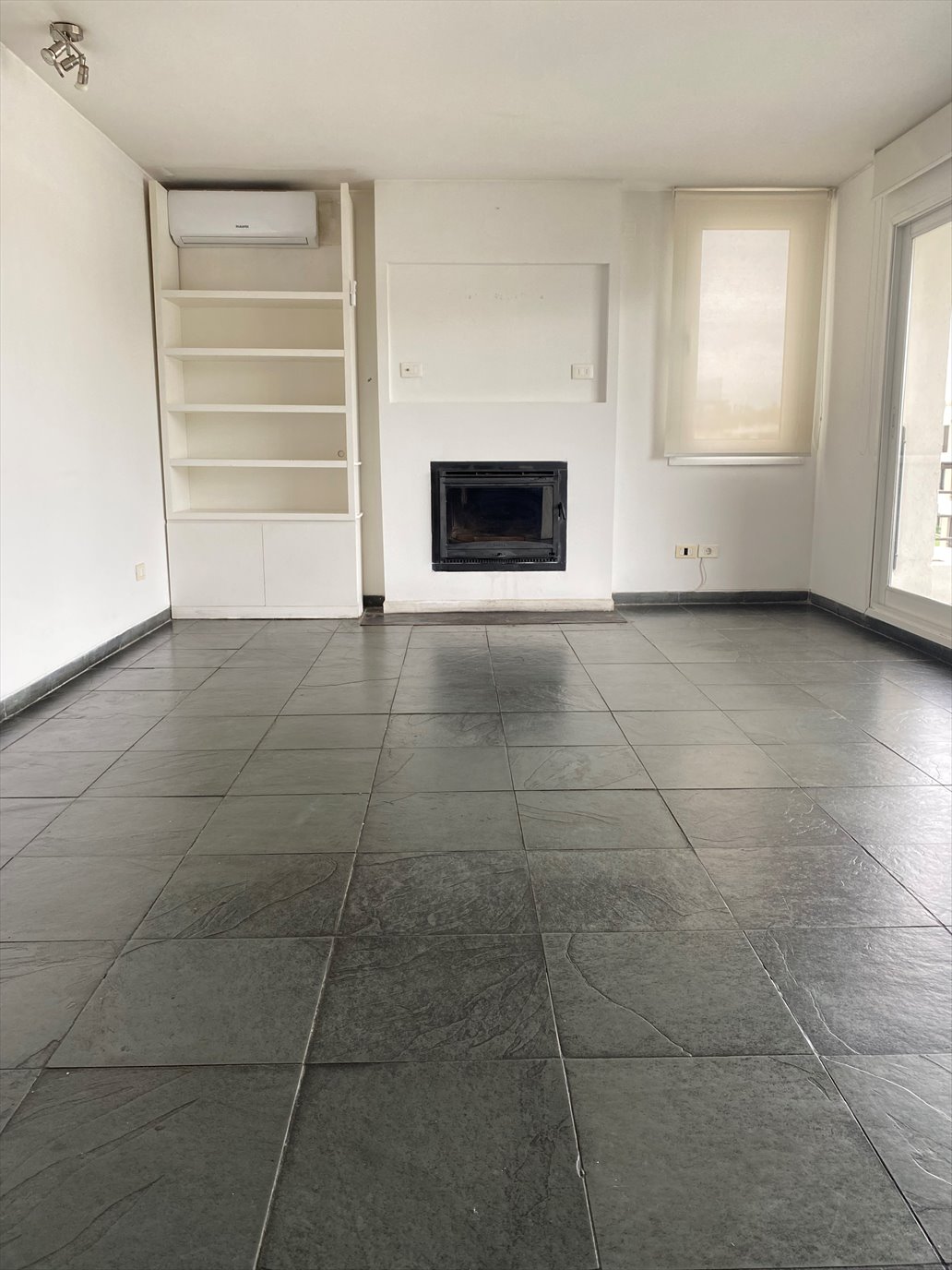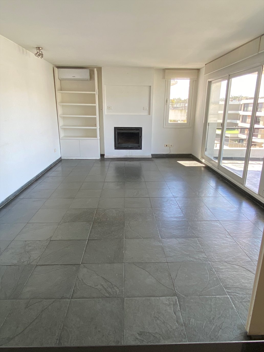 Living-comedor con estufa a leña de alto rendimiento y salida a amplia terraza con parrillero