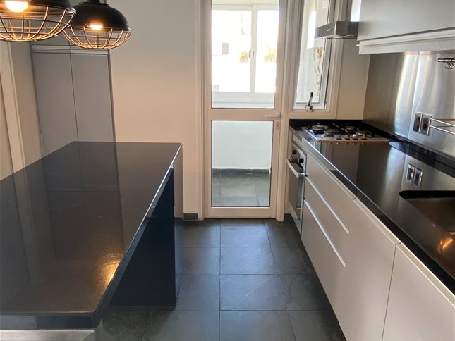 Cocina integrada (pero con puertas corredizas hacia el living) con terraza lavadero.