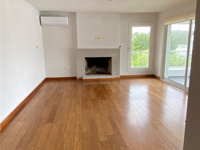 Living comedor con estufa a leña, salida a terraza con parrillero.